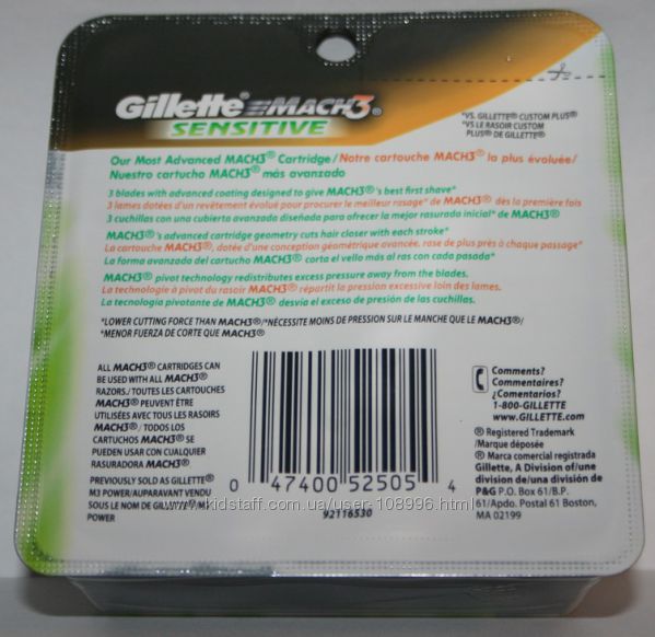 Мой интернет-магазин [ссылка удалена]Настоящие оригинальные лезвия GILLETTE MACH3 SENSETIVE 4 штуки в упаковке - 360 гривен. Лезвия действительно очень качественные, изготовлены в Бразилии для европейского и американского потребителя. Это намного более качественные картриджи в сравнении с теми что продают в Украине в торговых сетях и в среднем на 50-60 % дешевле.