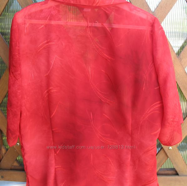 Блузка красивая, легкая, не жаркая на р.50. Ткань шифон, необычный красивый цвет, красный с разводами. На рукавах и по бокам небольшие распоришки.По замерам ПОГ и ПОБ - 52 см, ШП 42 см, ДР - 32 см, ДИ - 65 см. Немного приталена.