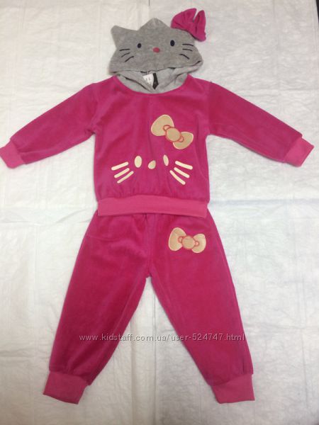 Темно- розовые (фуксия) с Кошечкой новые детские велюровые спортивные костюмы с капюшоном.
