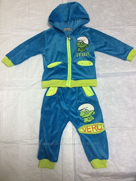 Голубые с салатовыми Смурфиками новые детские велюровые спортивные костюмы с капюшоном.