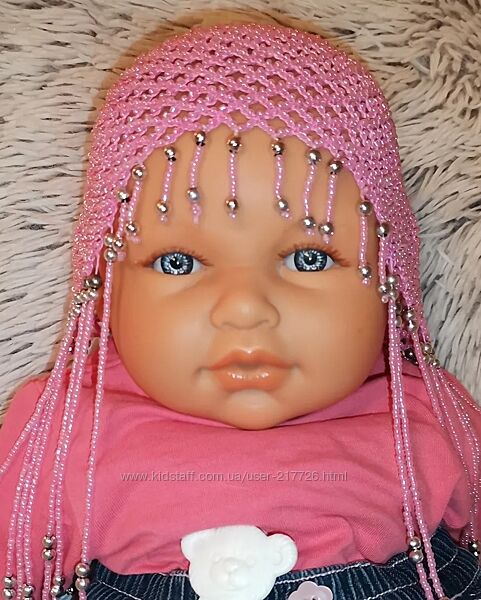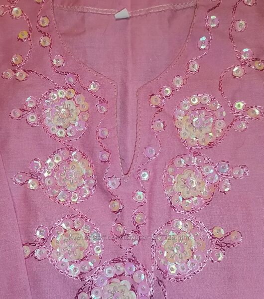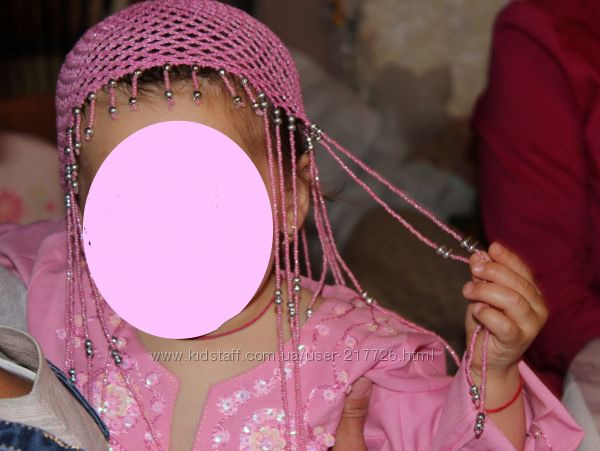 Красивый комплект из Египта. Одевали один раз. Состояние нового. Туника хлопковая,расшитая вручную бисером и пайетками. Шапочка из хлопковых ниток,полностью вышитая бисером.Замеры: плечи 20,5 см, длина 39 см, под рукавами 28 см,рукав 31 см.