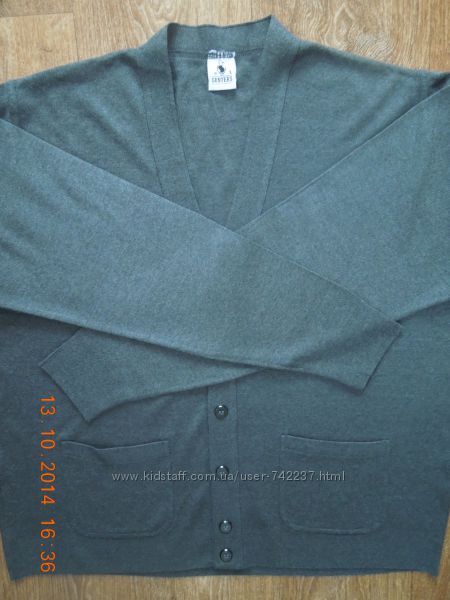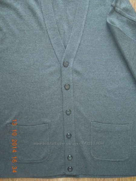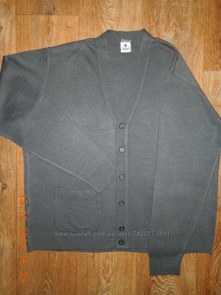 Джемпер на пуговицах, кофта. Цвет тёмно-серый, накладные карманы, ничего лишнего, под рубашку очень красиво. Б/у, но состояние отличное, одета раза три, после стирки стала шире и теперь велика. Без катышков, пятен, дыр и т.д..... Подойдёт не очень высокому мужчине "в теле" и даже с животиком.