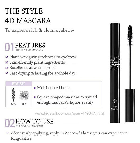 Missha The Style 4D Mascara комфортно пользоваться каждый день. Тушь влагостойкая (но не водостойкая), поэтому она сохраняет стойкость в течение всего дня, не осыпается и не размазывается.