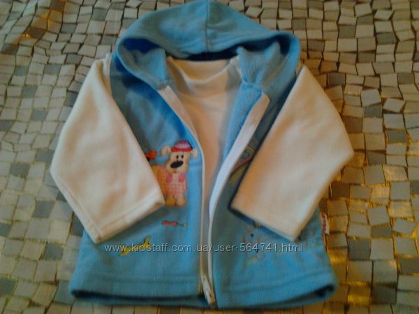 Свитер и жилетка из флиса. Цвет свитера - молочный.На плече застежка на пуговицы для удобства одевания. Жилетик - голубой, с капюшоном, застегивается на молнию, с красивой аппликацией