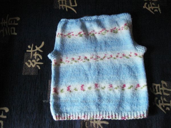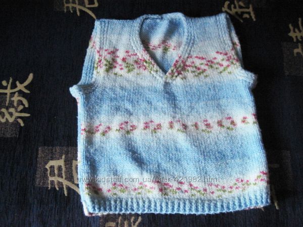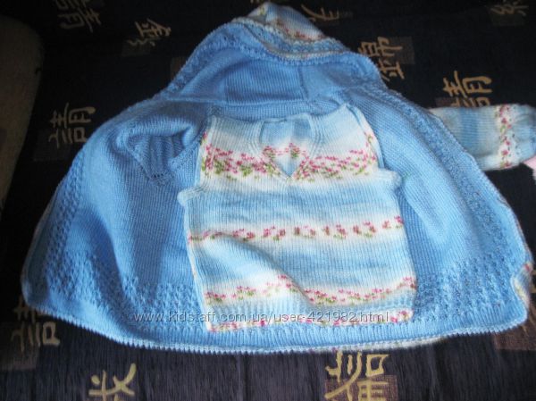 Комплект кофта самовязанная с капюшоном двухсторонняя и жилет аналогичный рисунок, верх кофты - полосы с меланжем, по краю узор в дырочки, подмышки 35 см, длина 45 см, рукав реглан, длина с плечом 37 см, застежка на пуговицах. Внутри - голубая, пряжа, думаю, акриловая, небольшая закошлаченность, жилет - ширина в груди 33 см. длина 35 см. цена 130 грн за комплектДругие объявления продавца