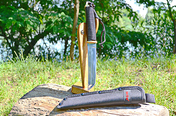 Руків’я ножа прямокутне у поперечному перетині, міцне і по-спартанські просте: на широкий хвостовик ножа для надання додаткового об´єму накладено дві дерев´яні накладки, на яких зроблено намотування з міцного шнура на кшталт паракорду.