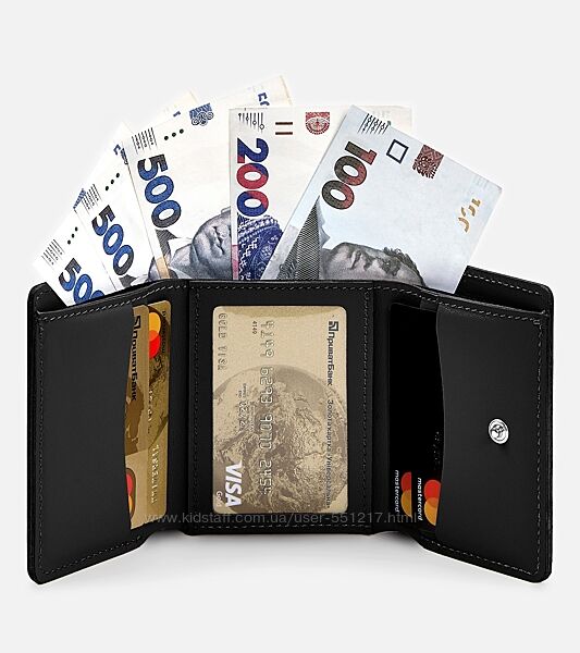 Внутри 2 отделения для купюр, 4 отделения для карт, 1 карман с прозрачным окошком и отделение на кнопке для мелочей и монет.