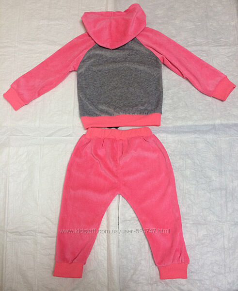 Темно- розовые (фуксия) с Кошечкой новые детские велюровые спортивные костюмы с капюшоном.