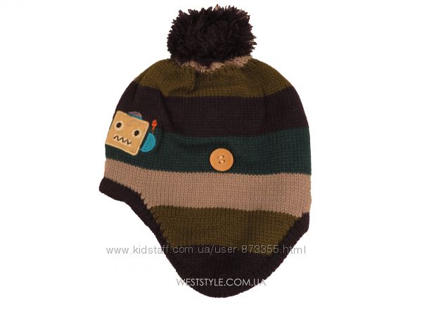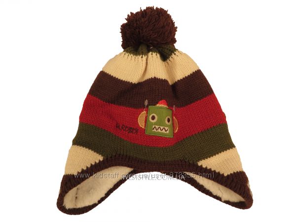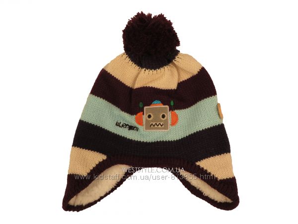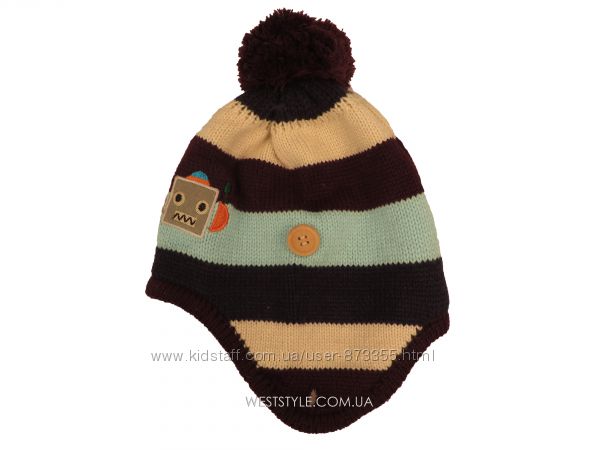 Детская вязаная шапка в полоску с помпоном и изображением работа. Снизу есть обводок в шапки, что делает шапку очень оригинальной. В этой шапке вашему малышу будет тепло и приятно.