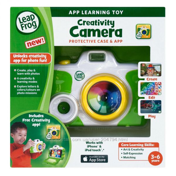 Чехарда Творчість камера App із захисний чохол працює спільно з пристроями iPhone або IPod Touch поколінь 4 та 5-го (продається окремо)! Працює з iPhone 4/4S/5 та IPod Touch 4-го та 5-го поколінь. Чи не працює з LeapPad або Leapster Explorer, систем.