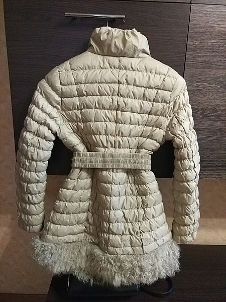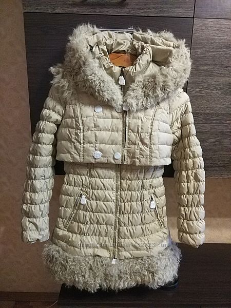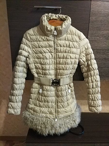 Женский пуховик. Цвет светлый оливково-молочный . Мех - натуральная козочка. Наполнитель - пух. Сверху жилет (тоже на пуху). Все меха отстегиваются, красивая куртка получается. Можно носить отдельно жилет. Размер указан L, наш 44. Внутри рукава резиночка трикотажная. Мерки : длинна с мехом - 85 см, без меха - 72 см, плечи - 42 см, рукав - 67 см, ПОГ - 50 см, ПОТ - 43 см, ПОБ - 50 см.Весь пуховик в слабую резиночку. Мерки по верху пуховика!