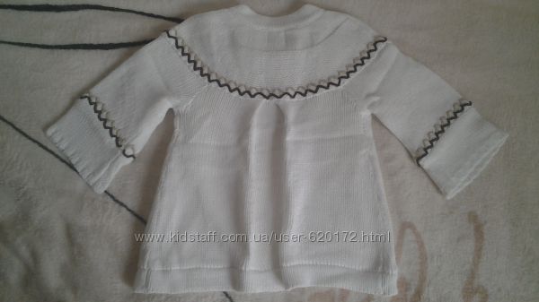Нарядная и тёплая кофта белого цвета, отделка бежевая и коричневая нить. Подкладка - флис, в т.ч. и в рукавах. РАЗМЕРЫ: 2Т, 4Т приблизительно на 1,5-2 года и на 3-4 годаРукав 3/4. Застёжка - кнопки, а пуговки как украшение. Два накладных кармана с пуговками и отделкой- шнурочком.Замеры по запросу.