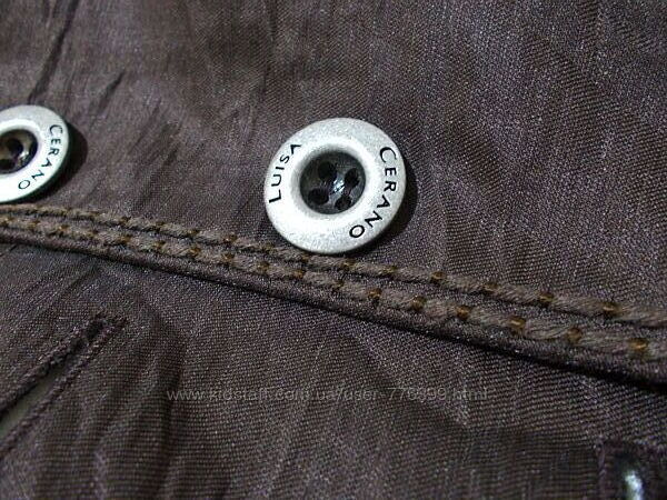 Жакет новый в идеальном состоянии, но без бирок. Ткань средняя (380 грамм), прочная, типа жатки с выраженным блеском. Приталенный фасон, поролоновые подплечники, полы закругленные, на краях рукавов фигурные разрезы (их можно подворачивать - на фото один подвернут), вдоль большинства швов, на краях пол и карманов толстой золотистой нитью вручную пришит один или несколько шнуров, застежка на 3 фигурные металлические винтажного типа пуговицы с клеймом бренда, ручные петли, 3 накладных кармана, подкладка в тон.На оф сайте подобные жакеты стоят 430€