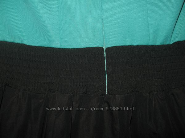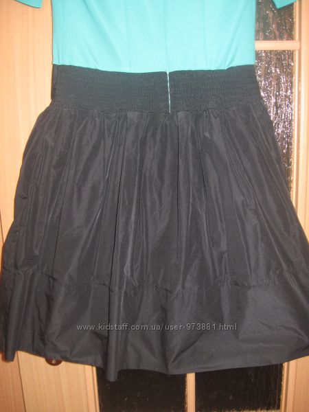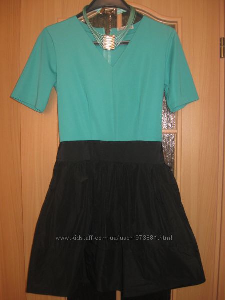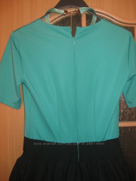 модне плаття,розмір 38.Верх стрейтчева тканина,низ двойна плащовка.Ширина у плечах 38 см,ширина під рукавами 40см,ширина талії 35см(тягнеться ззаді прошиті дрібні резиночки,видно на фото),довжина до пояса від плеча 40см,загальна довжина 86см.Ззаді застібається на замочок.Стан практично новий,один раз одягнене.