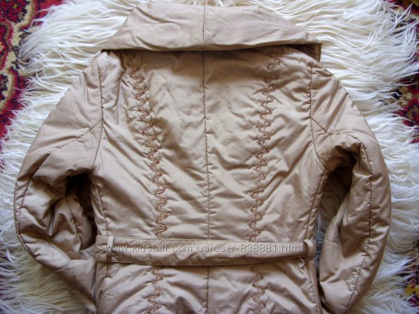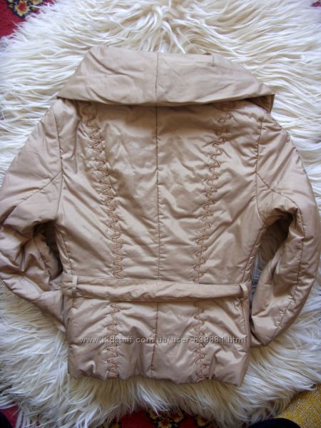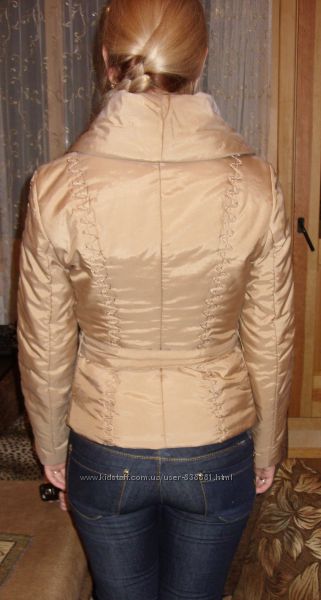 Фирменная демисезонная куртка красивого золотого цвета.Длина рукава 62см, длина по спине 57см.