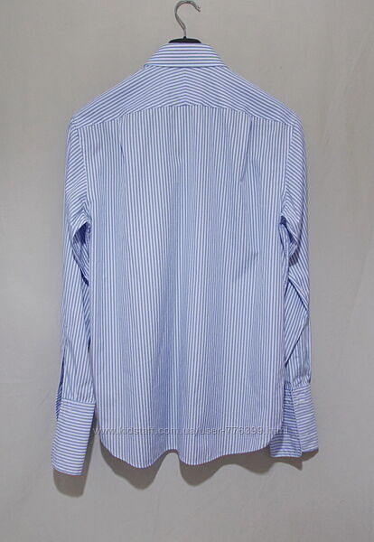 Рубашка новая в идеальном состоянии, но без бумажных бирок. Мягкий тонкий хлопок из нити двойного кручения(240 грамм) в бело-голубую полоску. Чуть приталенный крой, на спинке две длинные вытачки, сшивная кокетка, под ней два защипа для свободы движения, низ - полукругом, пуговицы под перламутр, контрастные ластовицы.На оф сайте подобные рубашки стоят 50€!