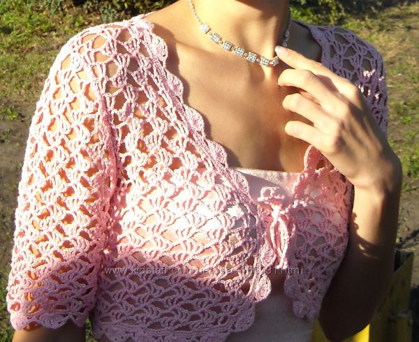Продам очень красивое нежное болеро,вязаное крючком, ручная работа. Одето ОДИН РАЗ!Впереди связывается шнурочком (не пришит к болеро), можно не связывать.Состав ниток не подскажу, покупала в магазине вязаных вещей.Замеры по запросу, но мой размер хс-с