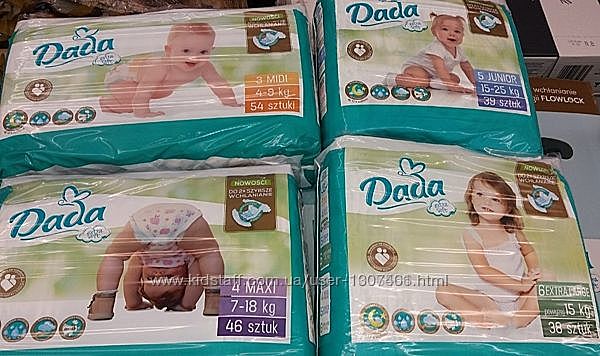 Подгузники Dada Extra soft (Дада екстра софт ) Постоянно в наличии все размеры: - Dada Extra soft 3 (4-9 кг) 54 шт; - Dada Extra soft 4 (7-18кг) 46 шт; - Dada Extra soft 4+ (9-20кг) 42 шт; - Dada Extra soft 5 (15-25кг) 39 шт. - Dada Extra soft 6 (16+кг) 38 шт.