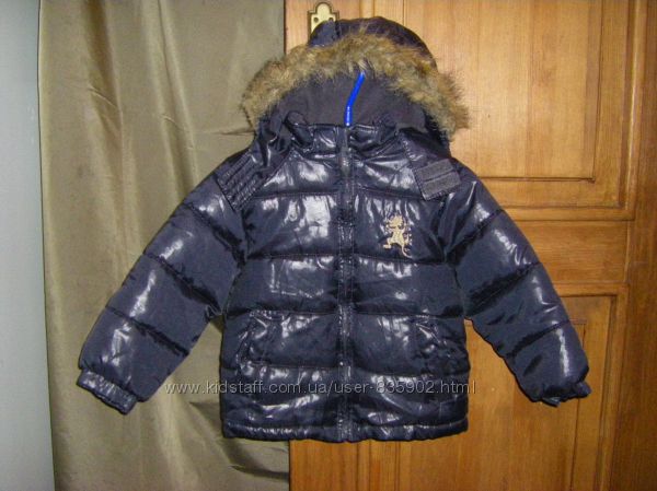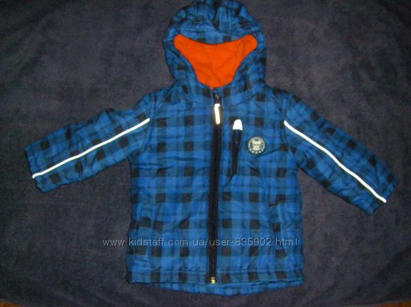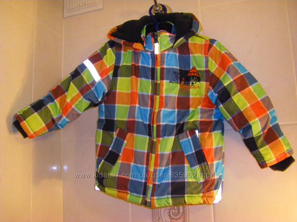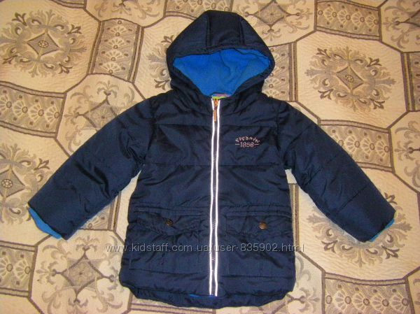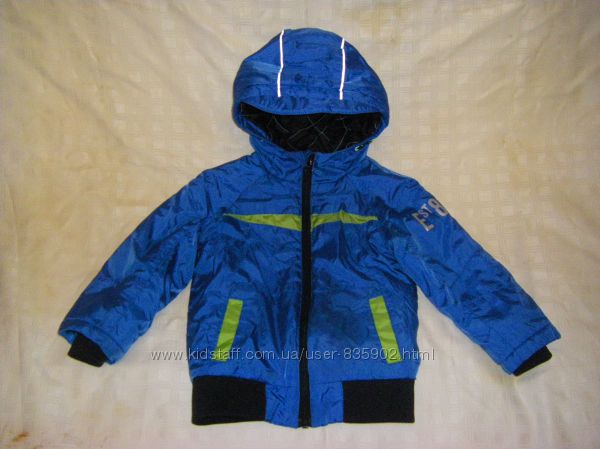 ф. 9 Теплая веселая демисезонная куртка Джордж, типа утепленной ветровки. Для мальчика 2-3 лет, рост 86-98 . Верх крепкий болоньевый, защищает от дождя и ветра, внутри стеганая подкладка. На синтепоне, легкая и теплая. Манжет-резиночка, можно делать рукав короче. Капюшон не отстегивается. На осень до 0 градусов.