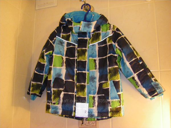 ф. 7 Теплая веселая, разноцветная осенне-зимняя куртка Topolino - Палитра с голубой подкладкой. Выглядит отлично, подойдет для мальчика 7 лет, рост 122. На бирке 122. Верх крепкая плащевка, защищает от дождя и ветра, внутри флисовая подкладка. Отталкивает воду и прекрасно стирается. На толстом синтепоне, легкая и теплая. Элластичный манжет с отверстием для пальца. Капюшон не отстегивается. На осень и зиму.