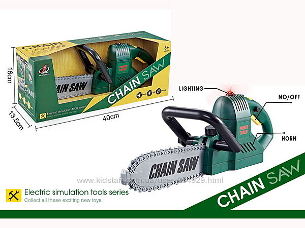 Нажав кнопку на ручке, которая находится на корпусе, будет крутиться цепь и звучит реалистичный звук пилы.