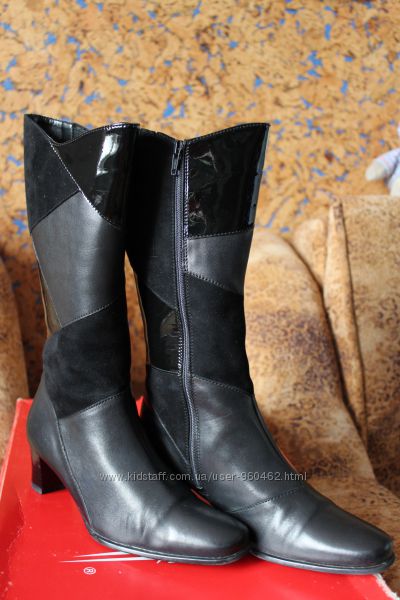 Сапоги ARA (made in serbia). Состав 100% кожа с замшей. Внутри на фланели (утепление). Цвет черный. Состояние отличное. Без ссадин, царапин и др. дефектов. Высота голенища - 34 см. Высота каблука - 4,5 см. По стельке - 25 см, но для полного комфорта - 24 см, т.к. носок заужен.Другие объявления продавца