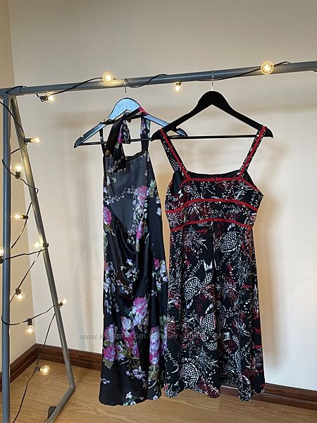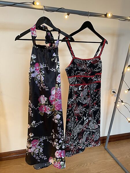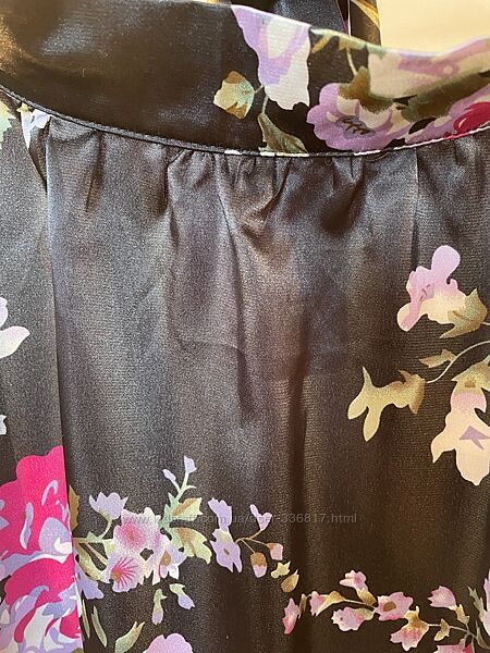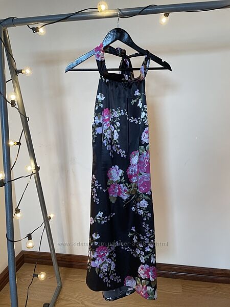 Плаття атласне з завязками на шиї, колір - чорний з квітами -300
