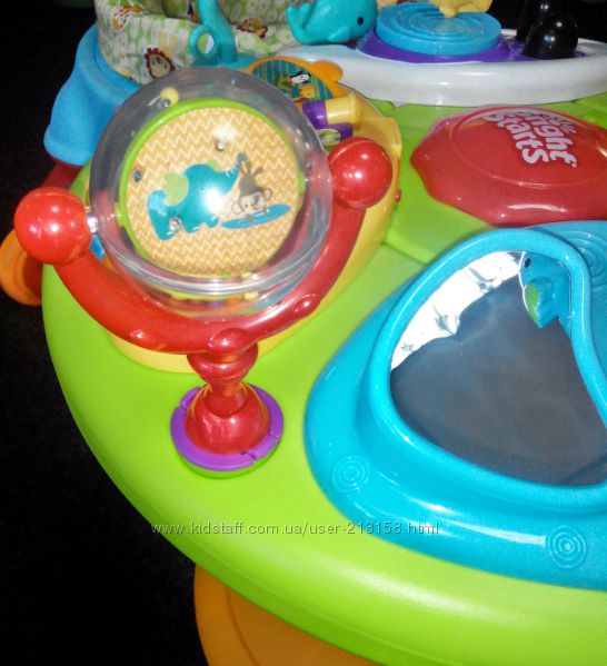 Як ви уже зрозуміли, до ігрового столу чіпляються ходунки, і ваш малюк може не лише бігати по колу, розглядаючи всі цікавинки активного центру, натискаючи на всі клавіші, і випробовуючи на міцність іграшки, але й обертатись на 360градусів, щоб побачити усе навколо себе, і дотягнутись до найцікавішої іграшки.