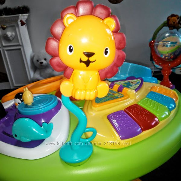 У розвиваючому центрі Кумедний зоопарк Bright Starts:можна погортати фліп-флоп книжечку, з колоритними тваринками-персонажами, що видають кумедні звуки;в залежності від того, на якій сторіночці розгорнута книжечка, піаніно видає або звуки жителів саванни: гарчить левеня, кричить папужка, трубить слоник, або грають веселі мелодії, або ж звучать нотки. Клавіші піаніно текстурні, що додатково розвиває тактильні відчуття малюка