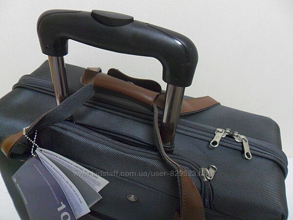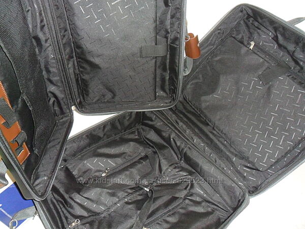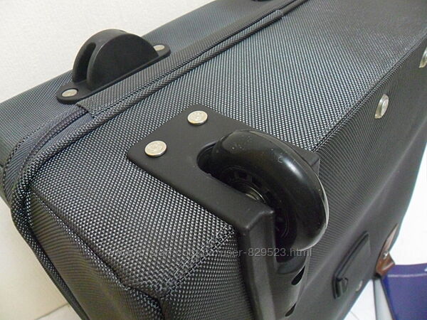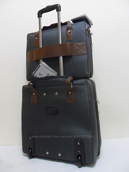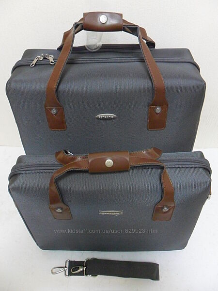 Чемодан 2-х колесный с сумкой "Samsonite". Малый. С двумя отделами для ноутбуков. Для женщин и мужчин. Для молодежи, для детей. Цвет серый. С отделкой искусственной кожей коричневого цвета. Внутри прочная подкладка. Внешний объем комплекта 55 литров. Цена 2250 грн.- Плотная, с грубостью, текстиленовая ткань с пропиткой и антицарапанной структурой.