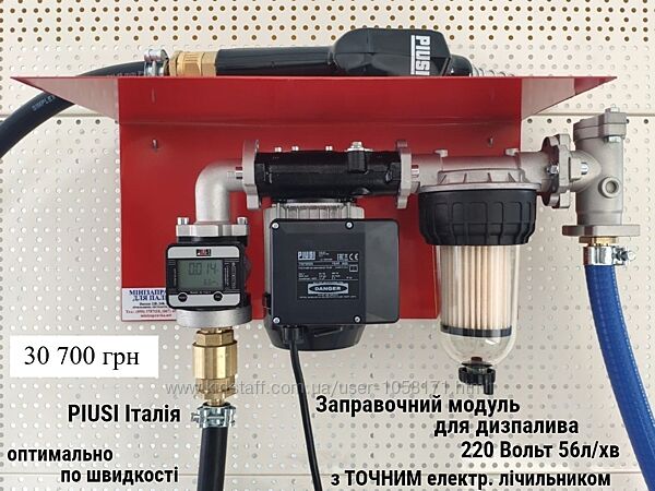 Насос 220В 56л/хв для дизпалива, PANTHER 56, Piusi (Італія);Електронний лічильник К-600, Piusi (Італія) (похібка до 0,5%) ; Пістолет роздатковий механічний SELF 3000, Piusi;Фільтр тонкого очищення паливо CF60 10мкм Piusi;Забірний рукав – 2м (або більше);Заправний рукав – 5м (або більше);Монтажна плита. Для рідини: дизельне паливо, пічне, біопаливо.