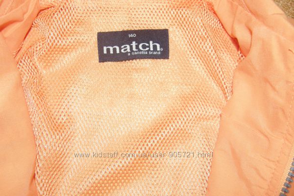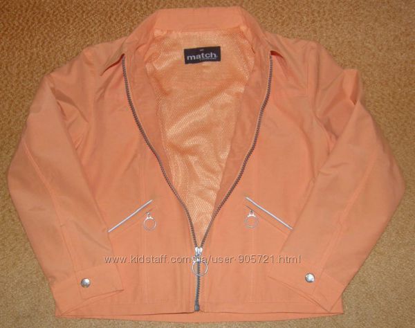 Ветровка для девочки MATCH a sanetta brand, пр-ль Германия. Размер 140 см. Замеры: длина по спинке – 48 см, ширина спинки - 46 см, длина рукава – 50 см, ширина манжета - 4 см. Состав: 70% хлопок, 20% полиамид, 10% полиуретан покрытый (отделаны кармашки), подкладка 100% полиамид (в виде сетки). Ветровка оранжевого цвета на молнии, имеет два внешних кармана, оба также застегиваются на молнии и один внутренний кармашек на липучке. Ветровка новая, но без бирок.Цена - 200 грн.