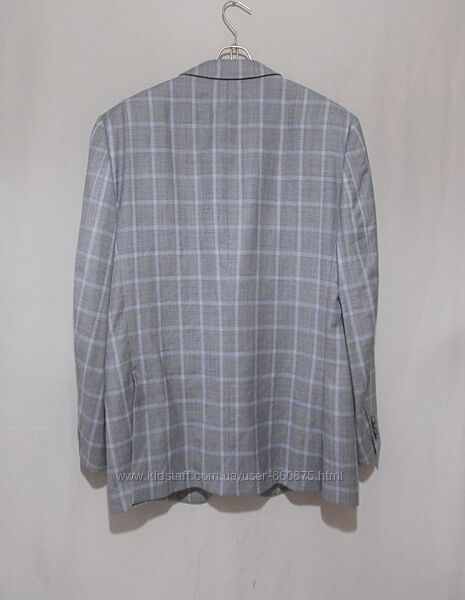 Пиджак в отличном, почти идеальном состоянии. Ткань тонкая (670 грамм), упругая, с выраженным лоском-отливом, неоднородное плетение черных и белых нитей создает эффект меланжевого серого цвета, разделенного на крупные клетки бледно голубыми полосами, застежка на 3 пуговицы, ручная вспушка вдоль лацканов и бортов, ручные петли, пуговицы из натурального рога на ножке. Приталенный фасон, сзади 2 шлицы, 8 карманов: по бокам с клапанами (застрочены), один на груди, 4 внутренних, полностью на подкладке: корпус - золотисто-серая, в рукавах - полосатая, пришитая вручную.На оф сайте подобные пиджаки из актуальной коллекции стоят ~2500€
