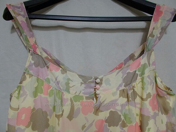 Платье новое (картонной бирки нет, на тканевой бирке остался пакетик с запасной пуговицей). Ткань очень тонкая (110 грамм), воздушная, пружинистая, с пастельным цветочным принтом, полностью на золотистой шелковой подкладке. Фасон - трапеция, ниже талии на уровне 58 см от верха заправленный поясок, вверху ткань присобрана, по верху и над низом перфорация (есть нюанс - сзади над перфорацией затяжка, которая из-за пестрого принта практически незаметна (убрана вовнутрь) - в цене учтено), края обработаны декоративным плетением, воспринимается, как мелкие зубчики.На оф сайте подобные из вискозы стоят от 200€