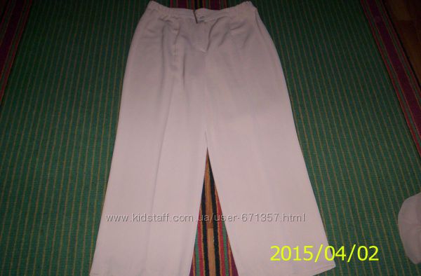 просто замечательный костюм! Приобретёте не пожалеете! Размер 50-52. Верх - пиджак с отличной ткани с блеском, низ: шифоновая блузка и брюки ( более плотный шифон). Пиджак: длина - 70см, ПОГ-58см, ПОТ -53см, объем регулируется пуговицей (можно перешивать на больше - меньше). Блузка: длина -63см, ширина - 58см (шифоновая, спереди двойной шифон). Брюки с плотного шифона, длина 104см (в запасе еще 2см подшито), ПОТ - 42см ( в талии резинка, тянутся до По - 50см), ПОБ - 61см