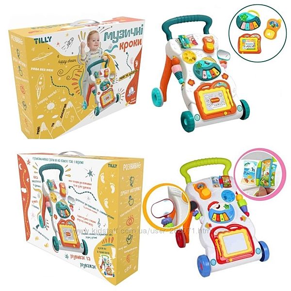 ф.1-3 Каталка-ходунки c развивающим центром "Музыкальные шаги" - 850грн многофункциональная развивающая игрушка, представляющая собой одновременно ходунки и интеллектуальную систему обучения и развития малыша. Удобная ручка и надежная конструкция помогут ребенку сделать свои первые шаги, а многофункциональный развивающий центр на передней панели надолго увлекут ребенка. Отсутствие острых углов сведет к минимуму риск ушибов при падении.