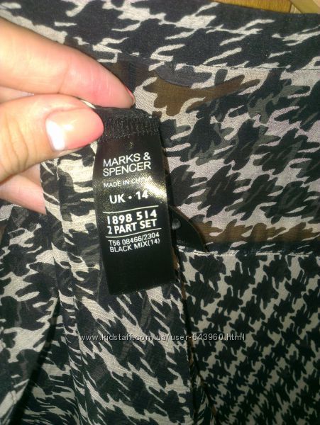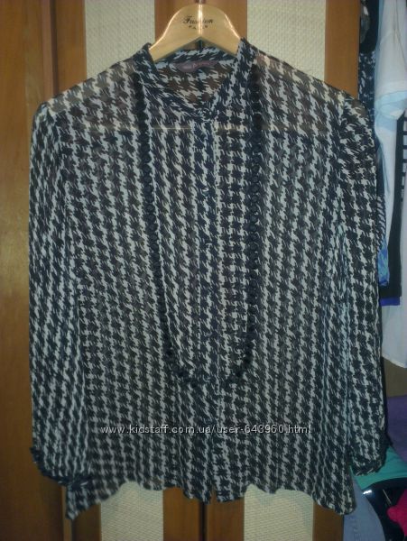 Размер 14 подойдёт на 12 р-р, то есть М-ка (идеально на параметры ОГ 93, ОТ 75 можно +-2 см) Смотрится очень стильно, узор "гусиные лапки"! На пуговичках, есть одна запасная на бирке Рукав 3\4 на пуговицах Состояние хорошее, носилась мало Цена 90 грн