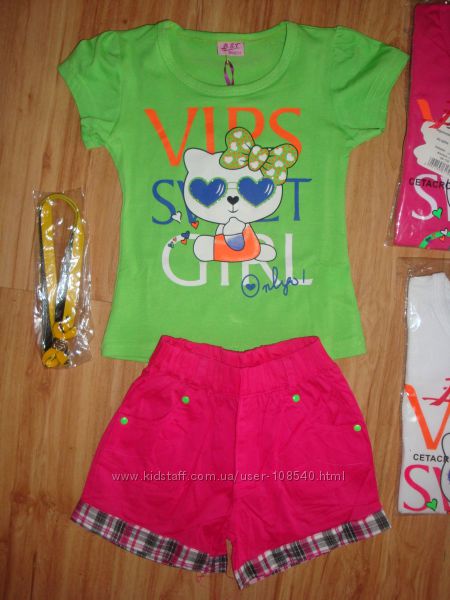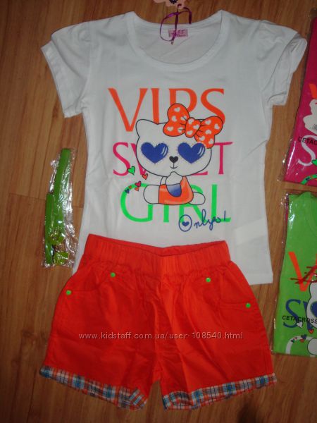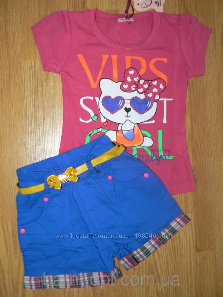 Ф.1-2. Летние комплекты для девочек: шорты и футболка, в комплекте есть поясок.104р. салатовая футболка Дл. - 37.5см, Шир. - 28.5см. Шорты Дл. - 25см, Пояс - 20.5см.