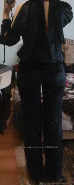 Шикарный королевский велюровый комбинезон.Пояс завязывается на уровне бедер. Спереди,на спине, на рукавах - вырез.