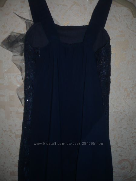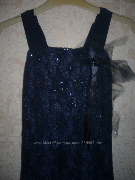 Невероятно красивое вечернее платье благородного темно-синего цвета с фатиновым цветком. Платье идеально облегает фигуру. Застежка сбоку на молнии. Роскошная кружевная вышивка с блестками по всему платью спереди. На лифе с левого бока красивый цветок с бусиной. Низ юбки дополнен легким летящим шифоном с правой стороны. Сзади лиф на резинке. Бретели сзади на резинке. Хорошо тянется. Очень роскошный изысканный наряд для Вашей модницы!Платье новое, так ни разу и не одето, только для примерки. Покупали на выпускной в 4 классе, но на него не попали! Поэтому состояние идеальное!