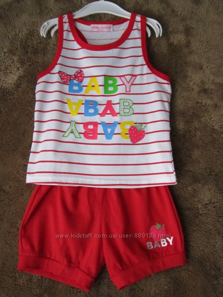 100% бавoвна. Розміри: ПОГ=36см, довжина від верхньої точки плеча=48см, ширина спинки=28см. Шорти: ПОТ=26см,ПОС 35см,довжина 43см