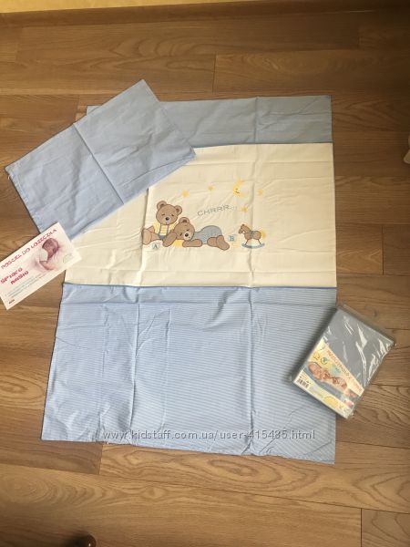 Комплект постели включает пододеяльник и наволочку.Размеры стандартной детской кровати. Пододеяльник 120х90, наволочка 40х60.