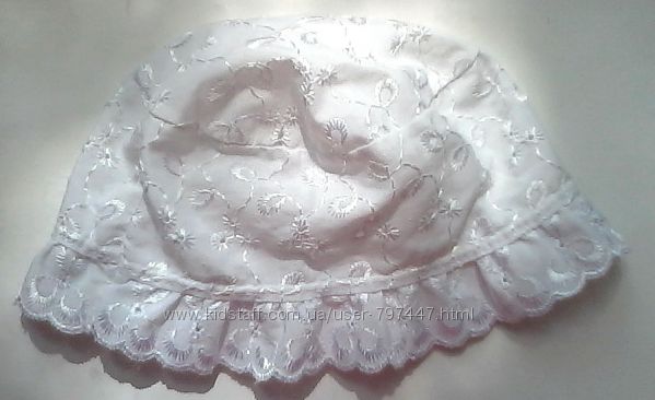 Продам летнюю панамочку моей дочки на возраст примерно 5-10 месяцев.Белая панамка из прошвы .ПОГ - 23 см.