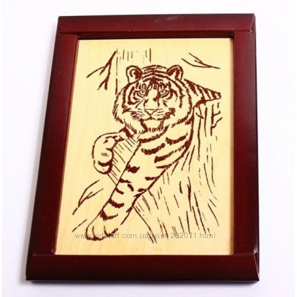 Після закінчення самого процесу випалювання Ви можете тонувати деякі ділянки Вашого твору за допомогою тонуючого розчину та пензля. Так зображення стане більш реалістичним і «глибшим».Після закінчення випалювання на великій заготовці Ви можете помістити роботу в рамку, яка як приємний бонус також йде в комплекті, і подарувати тому, кого любите.