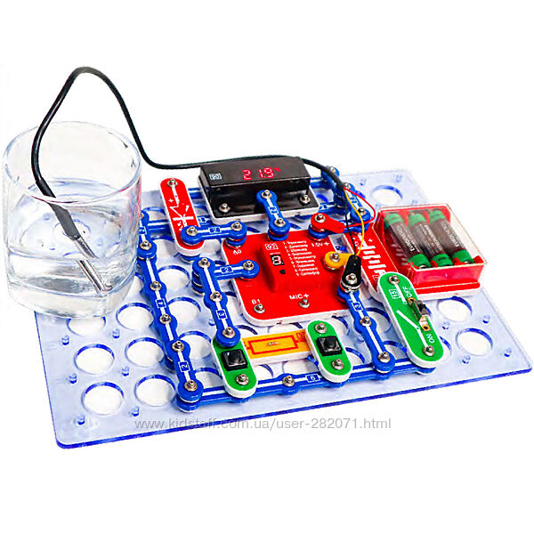 Конструктор дозволяє дитині своїми руками створювати світлові і звукові сигналізації, ліхтарик з трьома режимами, допоможе в знайомстві з логічними елементами, вивченні транзистора, регулюванні яскравості і гучності. За допомогою конструктора можна зібрати такі схеми: Ліхтарик, Резистор як обмежувач струму, Лампи при паралельному і послідовному з´єднаннях, Резистор і реостат при паралельному і послідовному з´єднаннях, Тестер електропровідності, Звук і світло, Одночасне регулювання яскравості і гучності, Сирена з підсилювачем, Шунтування та багато інших. У комплект входить інструкція, за допомогою якої дитина зможе зібрати 118 електросхем, що дозволяють на практиці освоїти ази управління світлом, звуком і електрикою. Живлення: батарейки 3хАА (не входять до комплекту). Рекомендовано для дітей віком від 8 років.