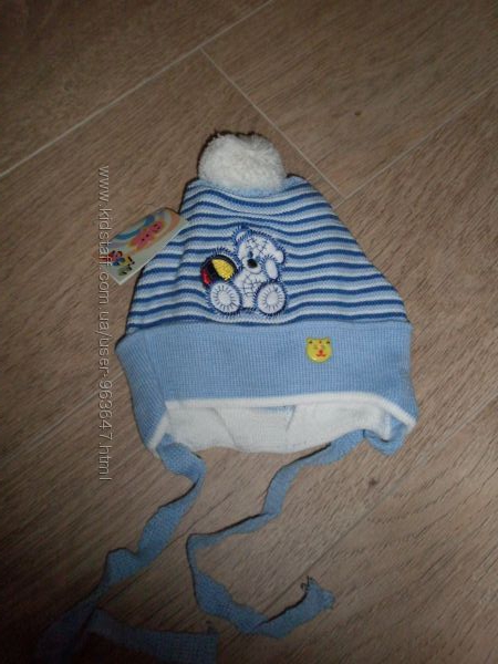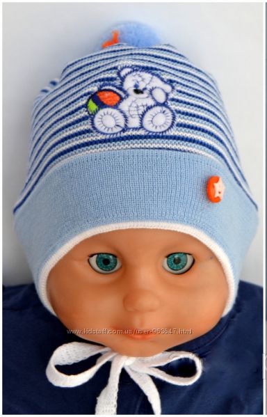 ф.2-3 Тедди, хлопок, р. 42-46 см (6-18 мес). голубая Шапочка вязаная из хлопка. Для детей 6 мес - 1 года. Размер 42-46. Хорошо тянется и удобно облегает голову. Вязка тонкая, но плотная. На ушах и лбу дополнительно защищает отворот. Вывязаны ушки. Завязки плоские, мягкие, приятные к телу. Отделка аппликацией мишки и вышивкой. Цена: 80 грн.