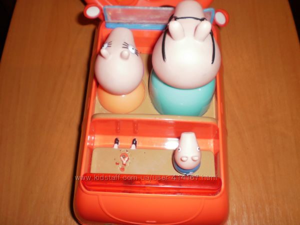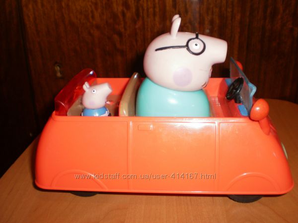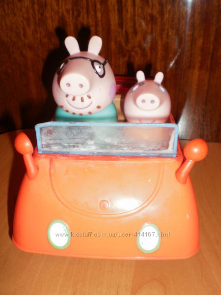 машинка семейства Свинки Пеппы на радио управлении, играет музыка, сигналит, хрюкает, ездит, фигурки не снимаются, есть дефекты не хватает Пеппы, подклеено стекло, длинна 18 см, высота по свину 12 см, ширина 12 сммой магазин по ссылке