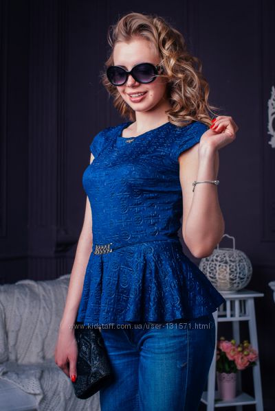 Модная женская блуза с баской и украшением на поясе,что очень красиво подчеркивает талию. Отшивается в синем и белом цвете.Размер универсальный 44-46