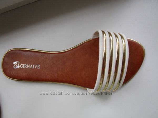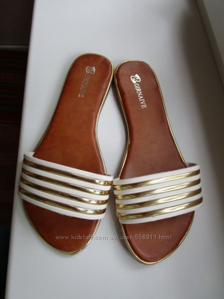 Стильные, удобные шлёпанцы. Замечательно смотрятся на ножке. Цвет белый с золотым.Маломерки, брать нужно на размер больше.