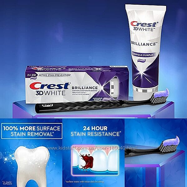 Crest 3D WHITE Brilliance LUMINUOS PURPLE toothpaste -ФІОЛЕТ ВІДБІЛЮЮЧА ПАСТА З НІЖНОЮ ПОЛІРОЛЛЮ toothpaste- з ФІОЛЕТОВИМ пігментом, ПРОТИ ЖОВТИХ ЗУБІВ - ЧУДОВО ПРАЦЮЄ ЗІ СМУЖКАМИ ДЛЯ ВІДБІЛЮВАННЯ